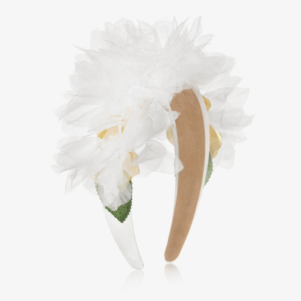 Pretty ivory hairband for girls from Spanish brand Graci. A wonderful finishing touch to an outfit, this lovely hairband has a fabric-covered flexible band for comfortable wear and is decorated with tulle flowers, sparkly gold fabric and faux leaves on the top.