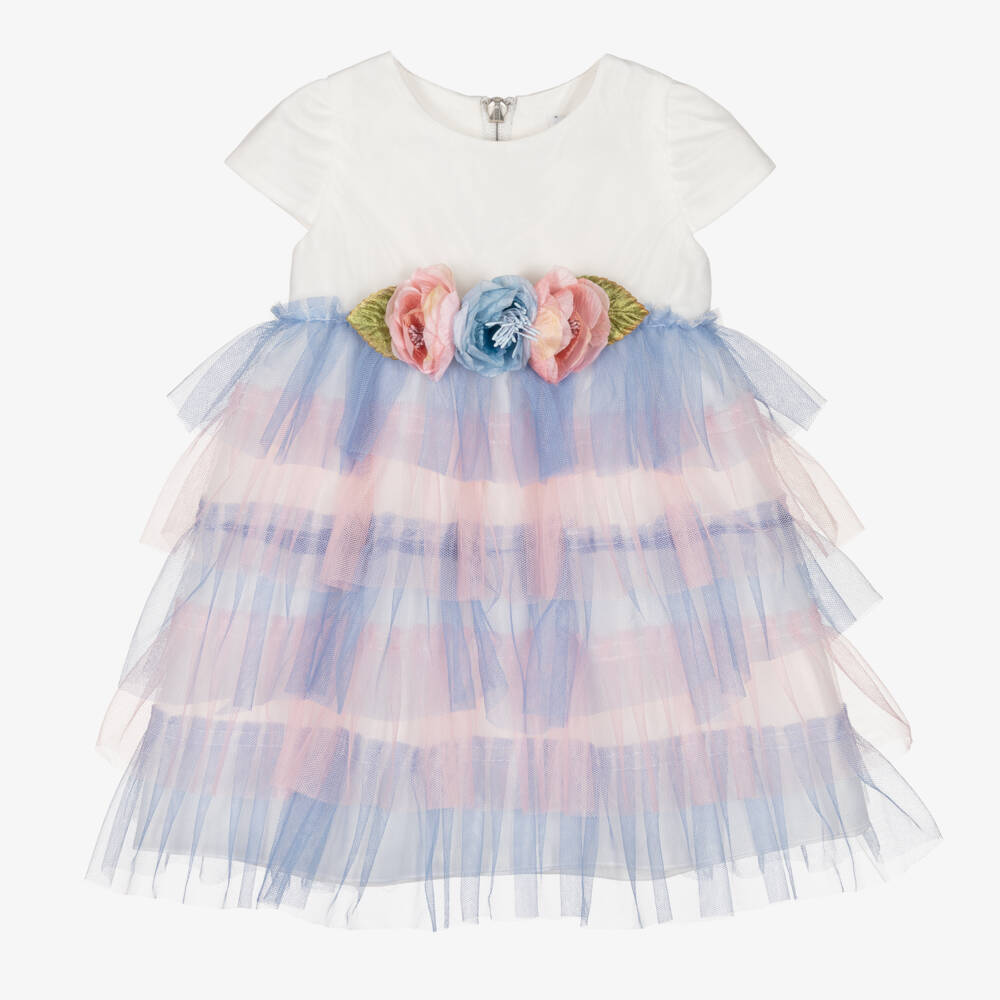 Exclusive to Childrensalon, a younger girls pink, blue and ivory dress from Spanish designer Graci, with a beautiful detachable floral brooch. Soft and silky with a ruffle tulle overlay, the dress has a lightweight lining for added comfort. Ideal for a special occasion, there are pretty cap sleeves and a back zip fastening for ease when dressing.
