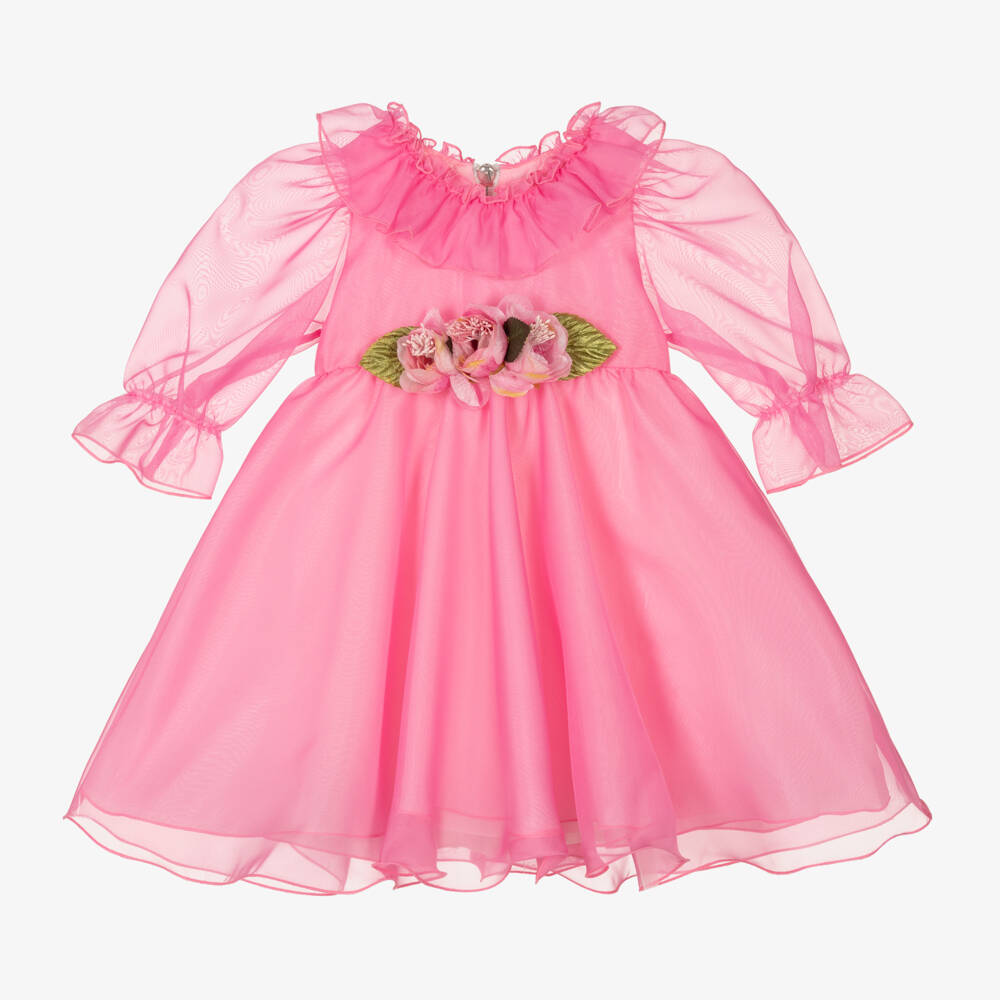 Beautiful pink chiffon dress for little girls by Graci, exclusive to Childrensalon. Fully lined for added comfort, it has a lightly elasticated neckline and sleeve cuffs creating feminine frills. The skirt flares out from the waist for a lovely drape and free movement. It comes with a 3D flower brooch which allows two alternative finishes and the exposed zip on the back is embellished with a rhinestone for a touch of sparkle.