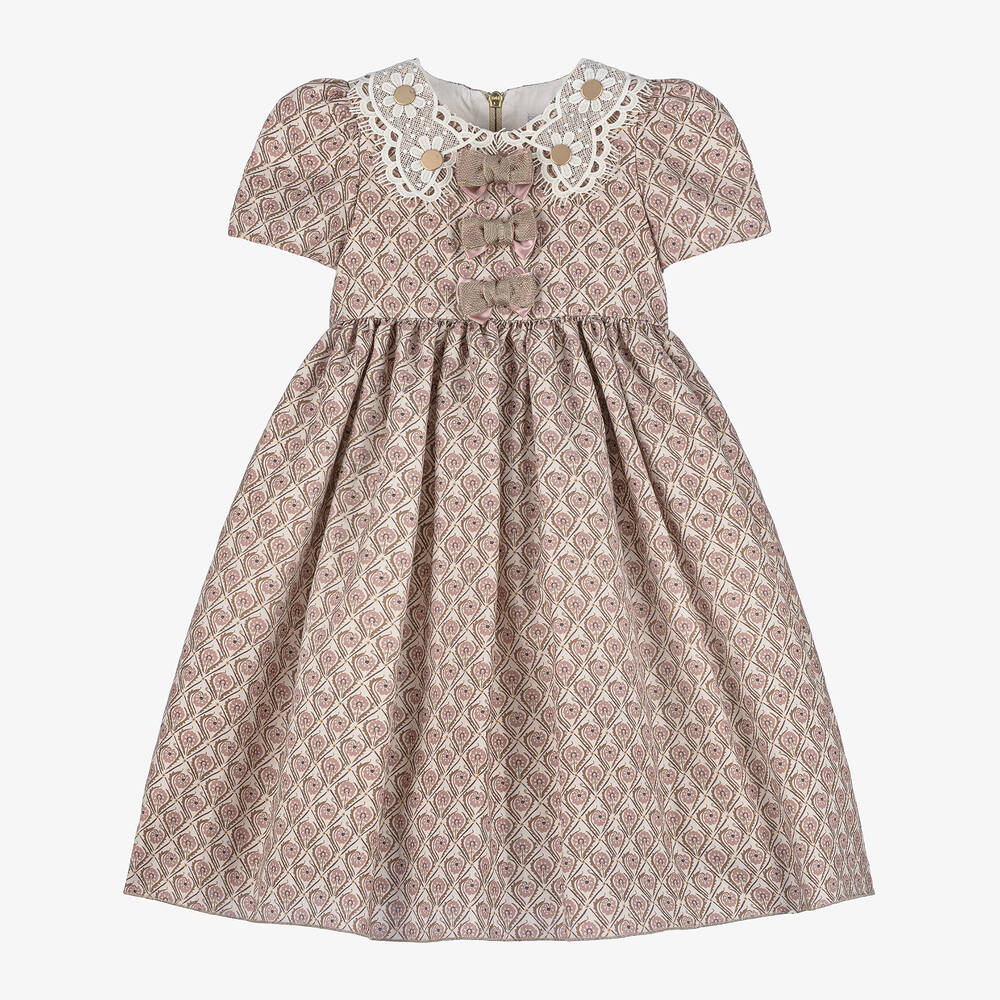 Smart pink cotton dress for girls by Spanish brand Graci, made in soft twill with a diamond-shaped, floral pattern. It has a lovely white lace collar with flowers embellished with gold metal centres, and shiny gold and pink bows sewn on the bodice. The short sleeves are prettily puffed and the skirt is full and gathered, with a satin underskirt. The dress has a full, soft voile lining for comfort, with a mesh frill to add volume and swish. There is an exposed gold zip fastening on the back.