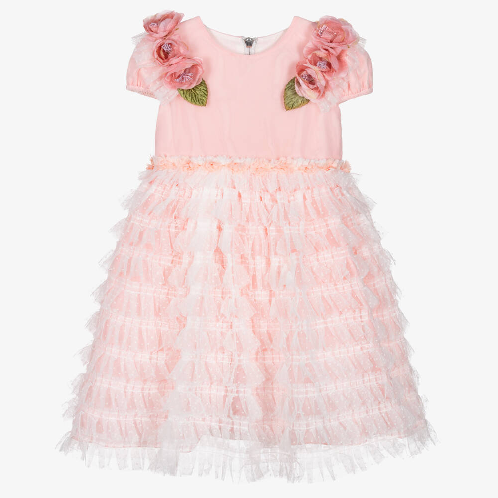 Exclusive to Childrensalon, a beautiful pale pink tulle dress for girls by Graci. The skirt has a full flare created from tiers of gathered tulle and has sweet flowers along the waistline. Pretty 3D flower details are attached to each shoulder via poppers for a glamorous finish. The exposed silver zip on the back is embellished with a rhinestone for added sparkle.