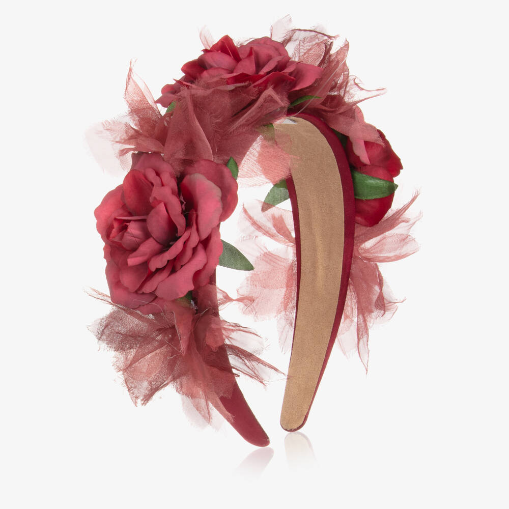 Designed by Spanish label Graci, a burgundy red hairband for girls. This handcrafted accessory has a soft satin-covered band, topped with beautiful red fabric roses and organza flowers. Comfortable to wear, the underside is made in soft, brushed fabric to prevent slipping.