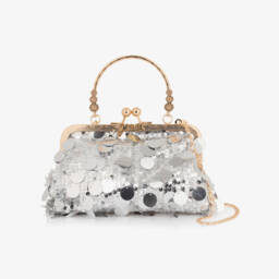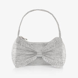 A glittery silver bag for girls by Graci, suitable for an extra special occasion. This chic design has a faux pearl carry handle and a detachable chain strap to sit over the shoulder. The main compartment is fully lined and the fold-over flap fastens easily with a magnetic popper closure. On the front, is a dazzling diamanté bow with a beautiful star in the centre.