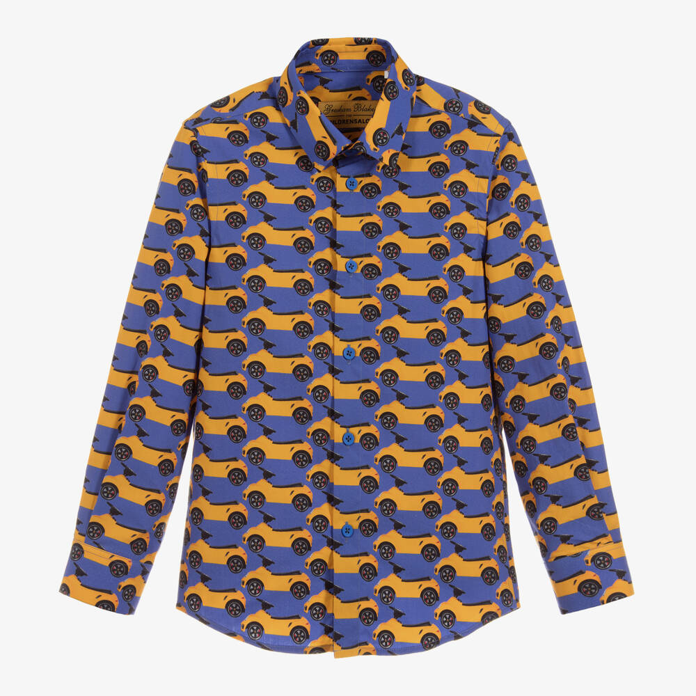 An exclusive collaboration between Gresham Blake and Childrensalon. This slim-fitting, blue cotton shirt for boys has a fun yellow toy car print. It fastens on the front with blue buttons.