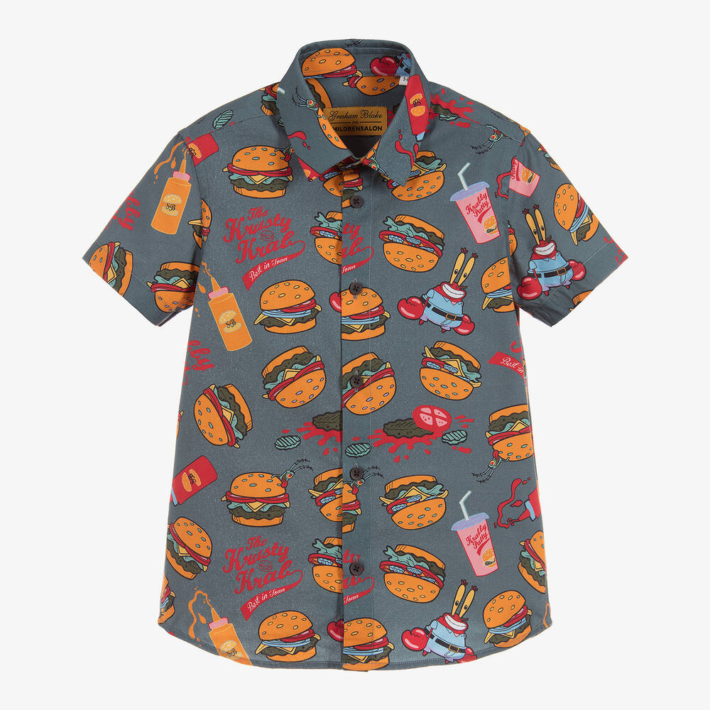 An exclusive collaboration between Gresham Blake and Childrensalon. This comfortable, grey, Mini-me cotton shirt has an all over multi-coloured print of fast food, featuring Krabby Patty from the popular TV series SpongeBob SquarePants. This short sleeve shirt fastens on the front with grey buttons.