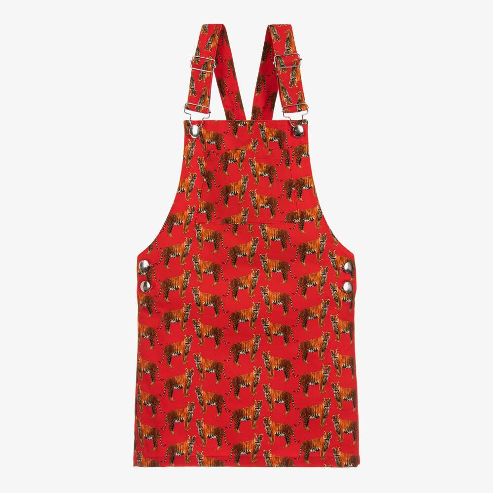 An exclusive collaboration between Gresham Blake and Childrensalon. This red cotton pinafore dress has a tiger print and useful adjustable straps, which fasten with metal clasps on the front.
