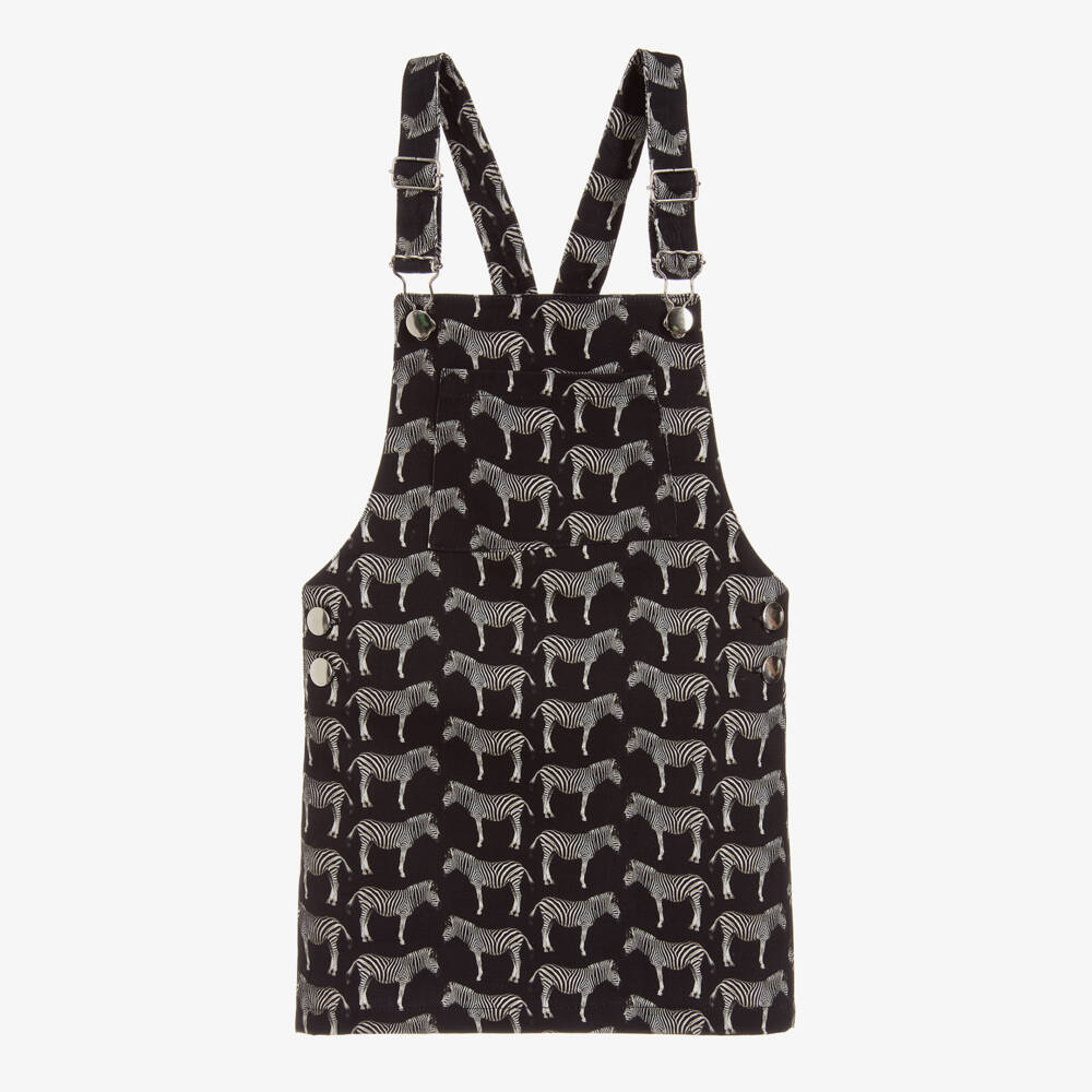 An exclusive collaboration between Gresham Blake and Childrensalon. This black cotton pinafore dress has a white zebra print and useful adjustable straps which fasten with metal clasps on the front.