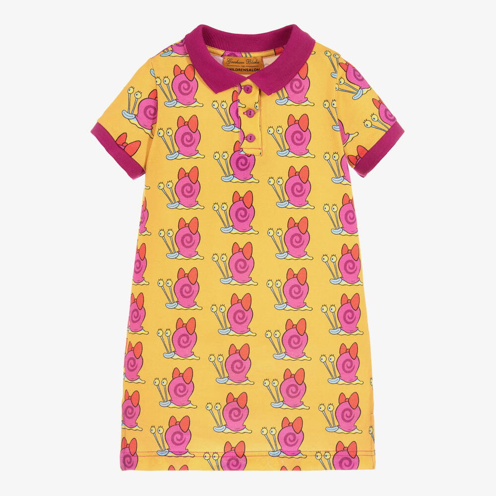 An exclusive collaboration between Gresham Blake and Childrensalon. This soft yellow cotton piqué polo dress for girls has a fun all over pink print of Mary the Snail, from the popular TV show SpongeBob SquarePants. It has a contrasting pink collar and it fastens on the front with matching pink buttons.