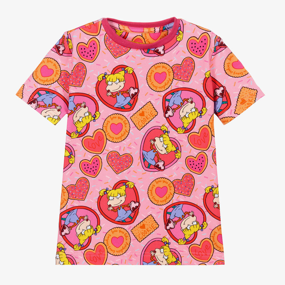 An exclusive collaboration between Gresham Blake and Childrensalon. Girls pink T-shirt, with a colourful pattern of Rugrats' Angelica character, hearts and cookies. It is made in soft and comfortable cotton jersey with a contrasting dark pink ribbed neckline.
