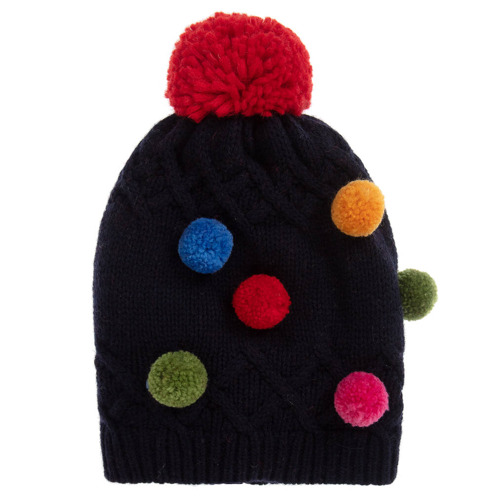 Knitted in pure wool, this navy blue hat from Grevi is warm and soft. So adorable for girls and boys, it has colourful pom-poms scattered around with a large red one on the top.