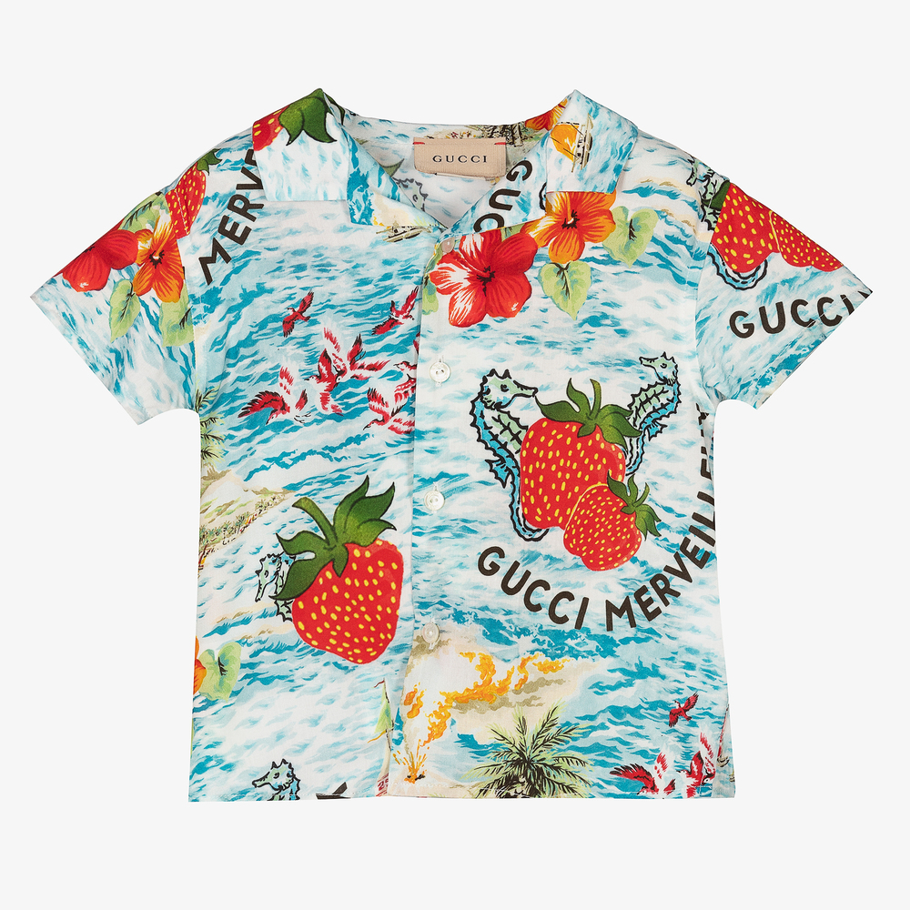 Blue shirt for baby boys by luxury Italian brand Gucci, made in lightweight viscose. It has an all-over strawberry smoothie and 'Gucci Marveilleux' print in red, green and black. There are front button fastenings and vented sides.