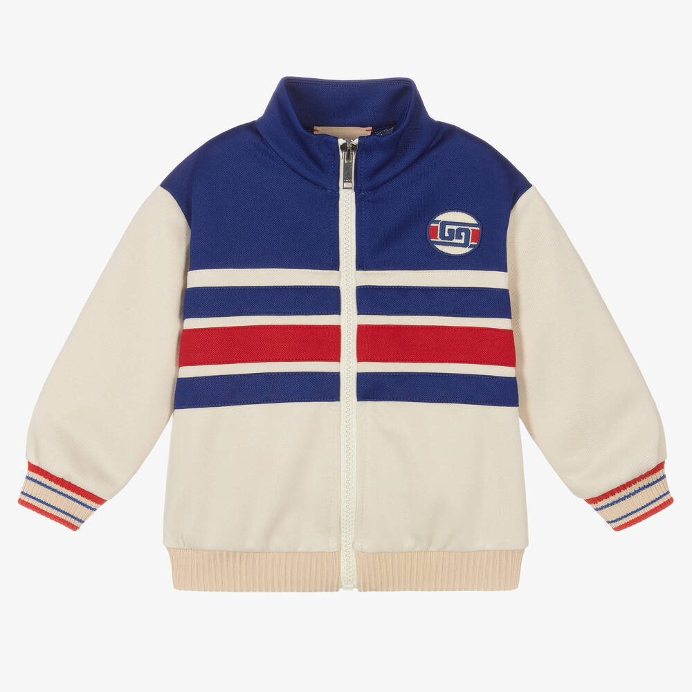 Blue, red and ivory zip-up top for baby boys from luxury Italian designer Gucci, inspired by retro sportswear. It is made in comfortable, cotton-blend technical jersey, with a 1970s-style embroidered logo patch on the chest. It has stretchy ribbed trims with stripes on the cuffs and a chunky silver logo-embossed zip for a designer finishing touch.