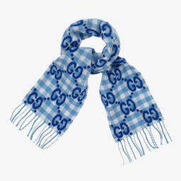 Luxuriously soft, blue and beige knitted wool scarf for boys and girls from Italian label, Gucci. Beautifully crafted with a stylish zigzag pattern, this cosy scarf features the signature green and red Web ribbed trim for a distinctive Gucci look.