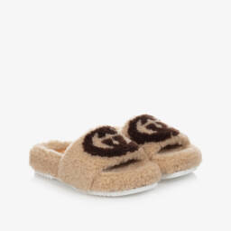 Mini-me navy blue sliders by luxury brand Gucci, made with soft and fluffy faux fur. The strap has an Interlocking G logo in a contrasting shade of red. They have a moulded rubber footbed lined with faux fur. The rubber outer sole is embossed with further logo detailing.