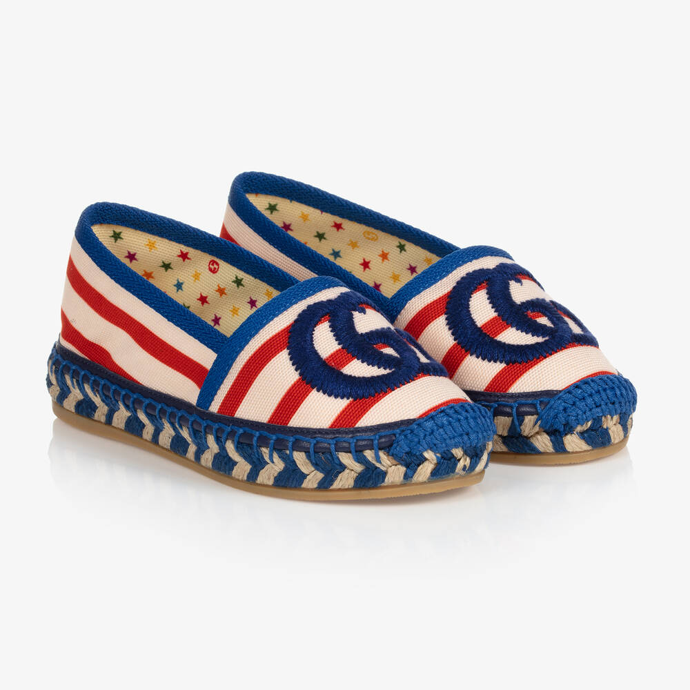 Children's striped espadrilles by luxury Italian brand, Gucci. Crafted from canvas with a vibrant red and blue stripe, the designer's GG logo is embroidered across the toes. They have a plaited cord platform and a non-slip rubber outer sole.