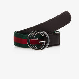 An elasticated blue and red Web belt for boys and girls from Gucci, accentuated with the luxury brand's iconic Interlocking G logo buckle. This classic style is trimmed with navy blue leather and secured with a hypoallergenic palladium buckle.