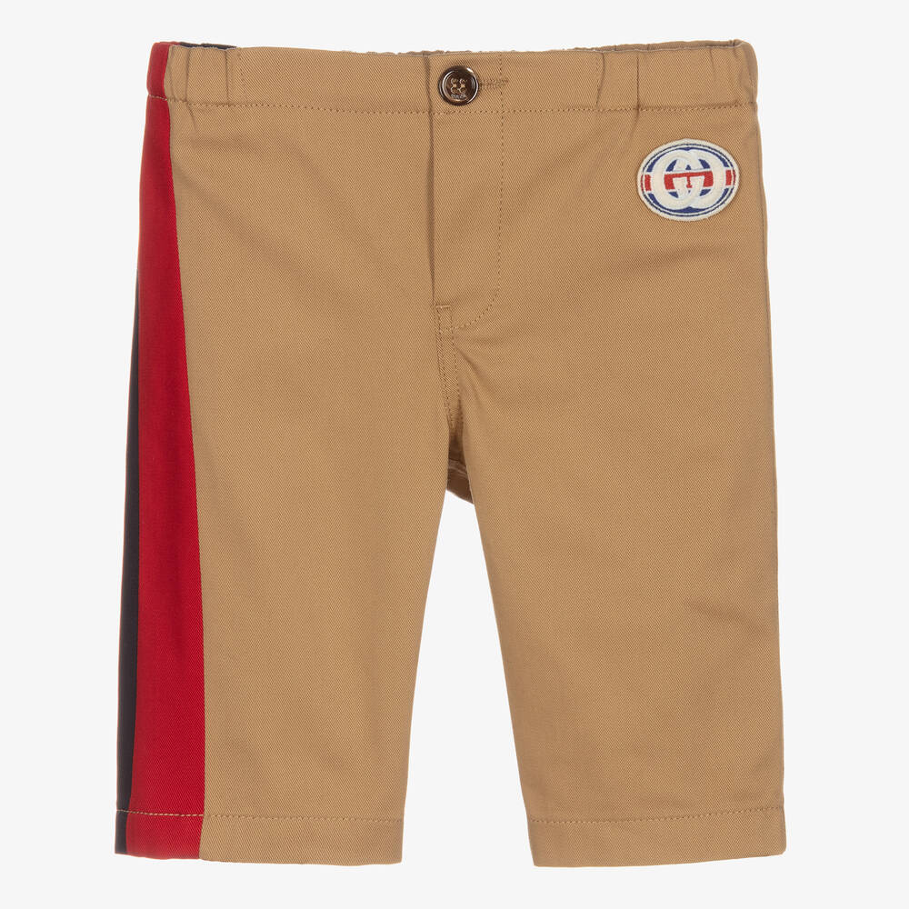 Beige trousers for little boys by luxury Italian designer Gucci, made in soft mid-weight cotton gabardine. They are trimmed with an ivory, blue and red Sylvie Web Interlocking GG logo badge. There is red and navy blue trim on one leg, along with a single button fastening and elasticated waistband.