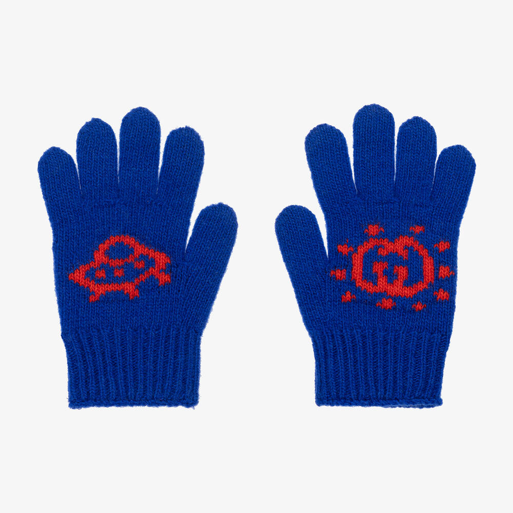 Blue gloves for boys by luxury Italian brand Gucci, made in soft and lightweight wool. Warm and cosy, with ribbed cuffs, they have a red Interlocking G logo on the back of one hand and a fun UFO design on the back of the other.