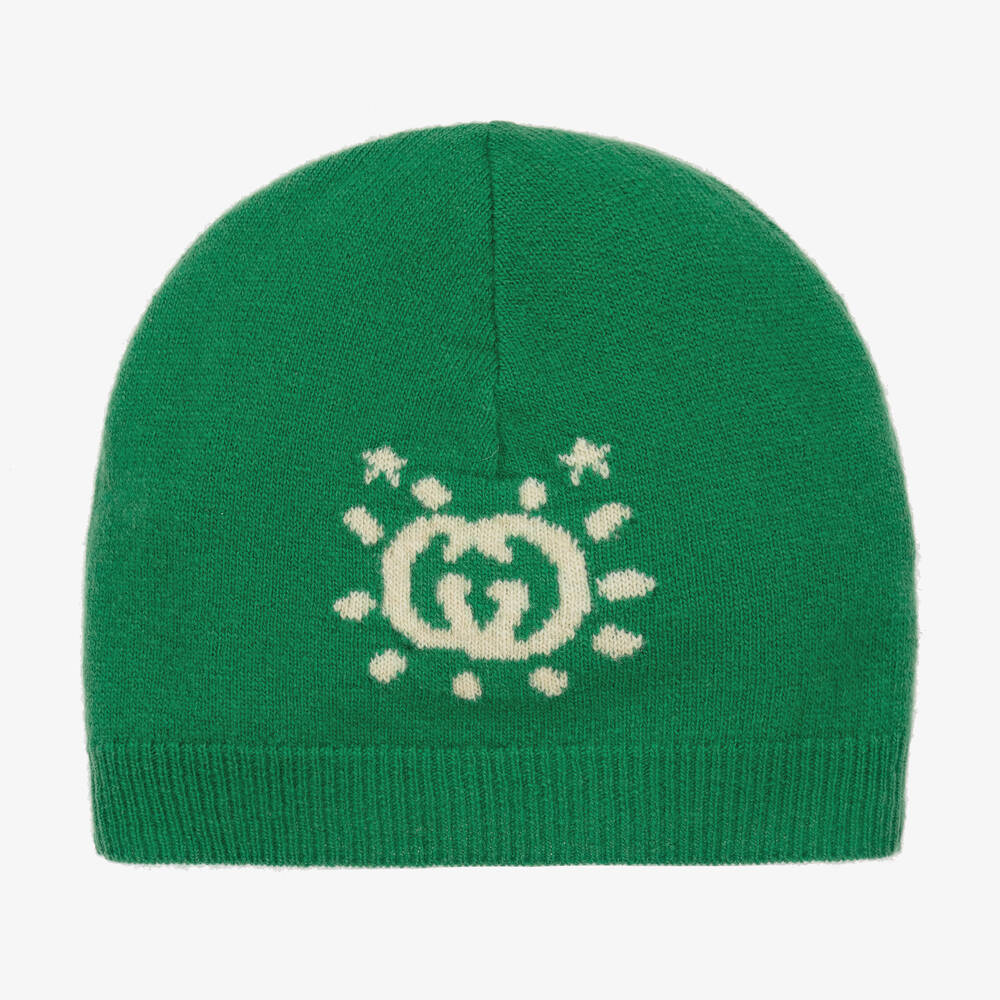 Green beanie hat for boys by luxury Italian brand Gucci, made in soft, lightweight wool. Warm and cosy, it has a ribbed brim and an ivory Interlocking G intarsia logo on the front. The back has a fun ivory UFO design.