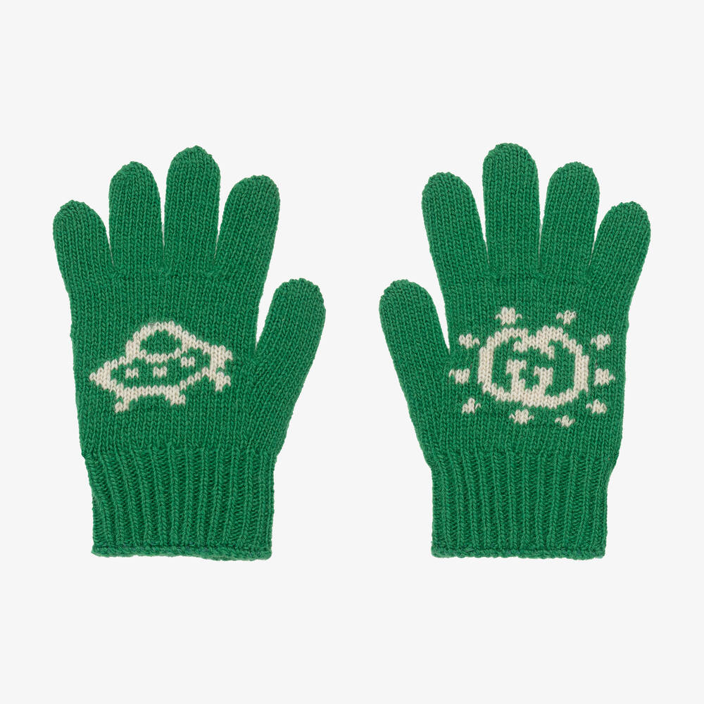 Green gloves for boys by luxury Italian brand Gucci, made in soft and lightweight wool. Warm and cosy, with ribbed cuffs, they have an ivory Interlocking G logo on the back of one hand and a fun UFO design on the back of the other.