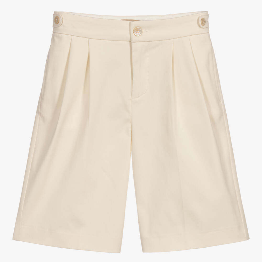 Designed for boys by luxury Italian brand Gucci, an ivory pair of gabardine Bermuda shorts, with red Gucci cat embroidery on the back. Soft and lightweight, they have stylish pleats and an adjustable waistband with button trims. There are on-seam side pockets, with a small besom pocket on the back.