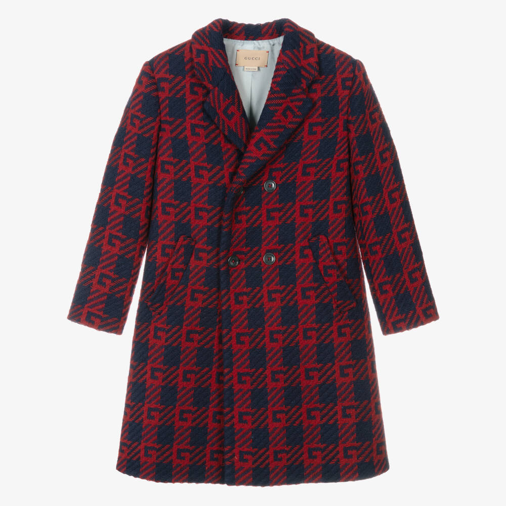 Vintage-inspired red and navy blue coat for boys from Italian luxury designer, Gucci. Elegant and traditional in style, it is made from woven wool with the brand's archival Square G design in a check pattern. Double-breasted, it has a stylish revere collar, front welt pockets and an inverted pleat on the back. The coat is beautifully finished with a pale blue satin lining.