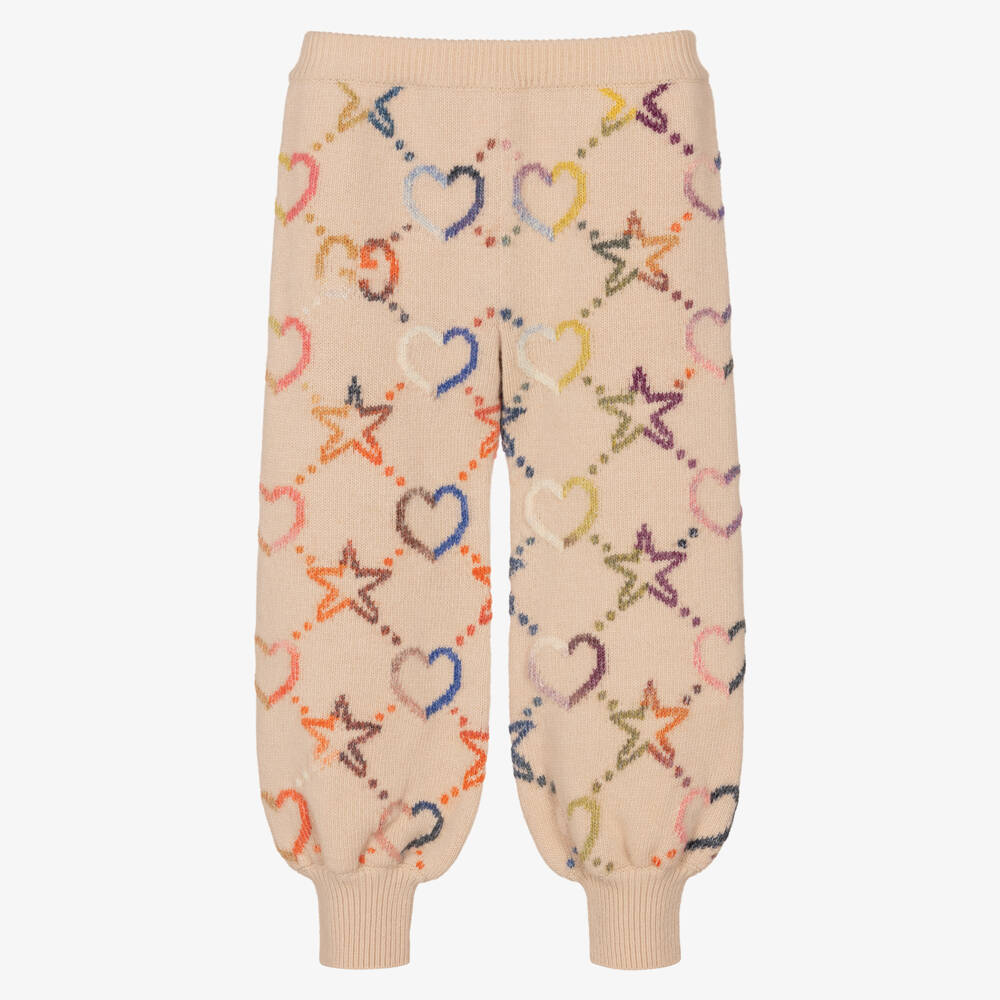 Knitted in beautifully soft wool, cosy joggers for girls by luxury brand Gucci. Resembling the brand's iconic GG logo design, they have a playful heart and star jacquard design in pretty pastel colours, stretchy ribbed trims and a wide cuffed leg for an extra relaxed look.