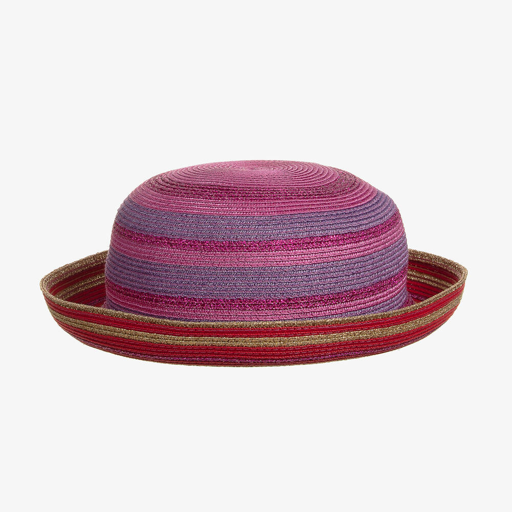 A pink hat for girls from luxury label Gucci, softly woven in faux straw. This lightweight hat is striped in glittering pink, red and gold, with a luxe gold-tone Double G logo detail stitched on the front. The cotton and viscose grosgrain ribbon part lining ensures a comfortable fit on little heads.