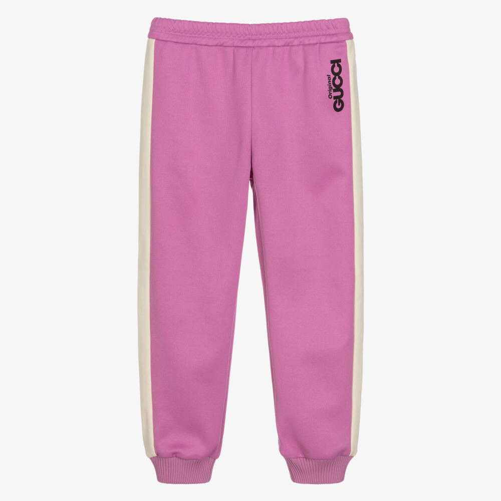 Girls pink joggers by luxury brand, Gucci. Styled like track pants, these casual trousers have ivory panels down the sides and an 'Original Gucci' print in black at the hip. They have an elasticated waistband and ribbed ankle cuffs.