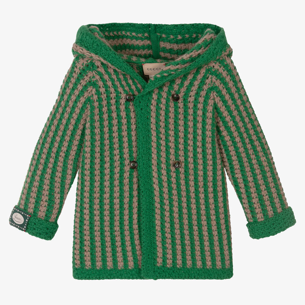 Green and beige striped cardigan for little boys by luxury Italian designer Gucci, made in a beautifully soft and chunky wool knit. Great for layering, this hooded design has a distinctive Gucci label sewn on the cuff and branded button fastenings on the front for a double-breasted silhouette.