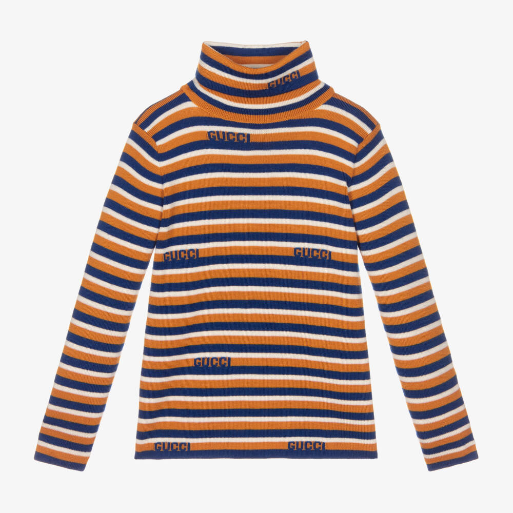 Younger boys and girls wool roll neck sweater by luxury brand, Gucci. This retro-inspired knit in orange, blue and white stripes is soft and stretchy, with an intarsia weave of the design House's classic logo in blue.