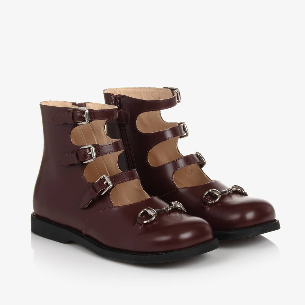 Stylish ankle-length leather shoes for boys and girls from luxury Italian fashion house Gucci, in a rich oxblood red-brown shade. Beautifully designed with a supportive ankle and three adjustable straps across the front, they have a side zip fastening for ease when changing. Adding Gucci's unmistakable style, they have a branded velcro tab and the signature silver-tone horse-bit detail as a nod to the House's equestrian heritage. They are comfortably lined in soft supple leather and have flexible rubber soles.