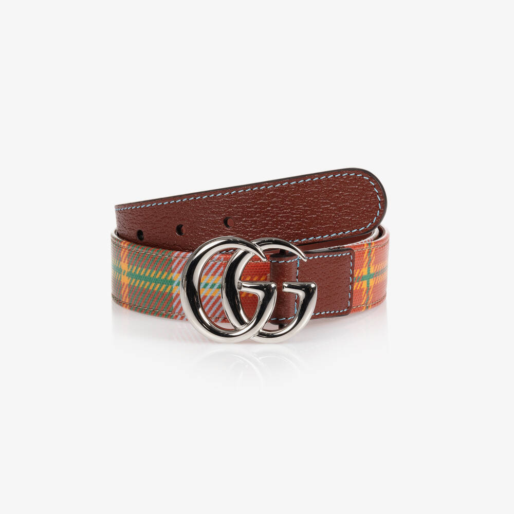 Red belt for boys and girls from Italian brand Gucci, lined in smooth brown leather with contrast blue stitching. This luxury accessory is made with the designer's signature Supreme canvas in red, green and blue check. Distinctively Gucci, it fastens with a silver Double G logo pin buckle on the front.