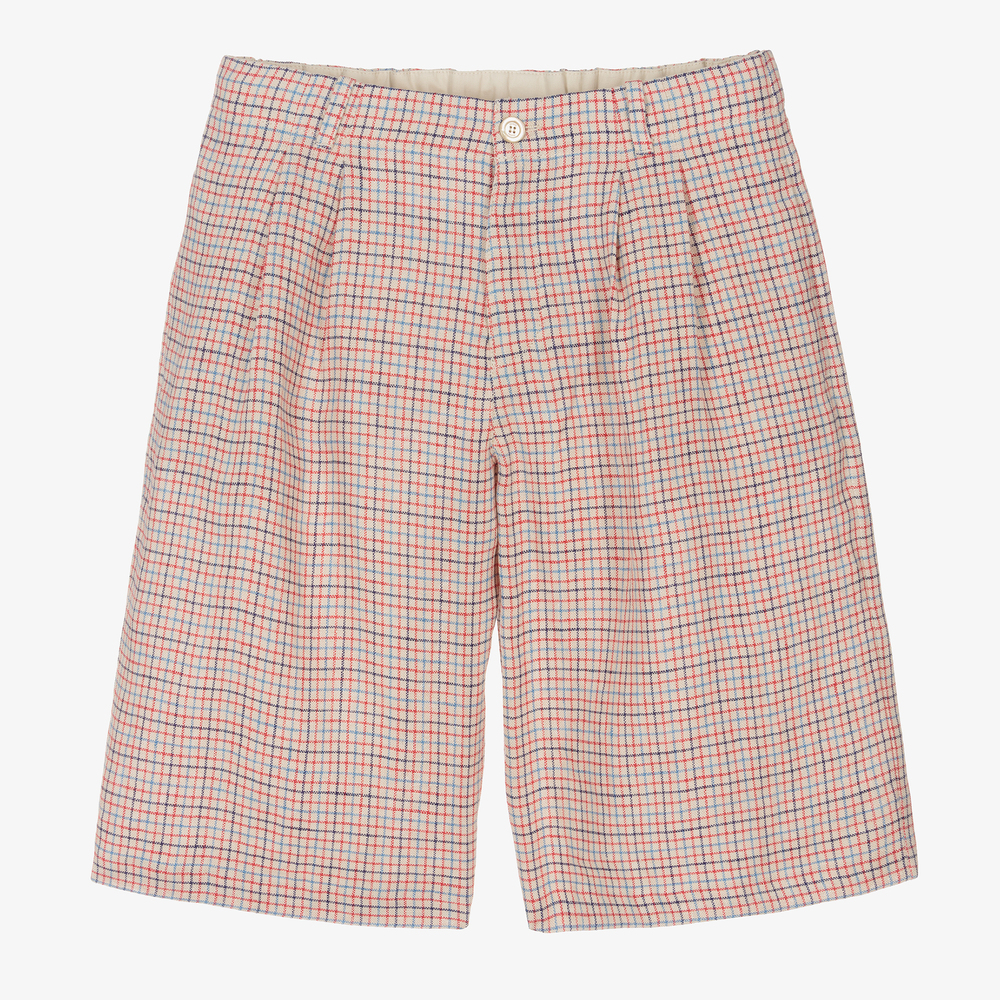 Beige, red and blue check short shorts for teen boys by luxury Italian brand Gucci, made in soft linen. With a causal Bermuda length, they have a loose-fit and lightweight feel. They are embroidered with a brand logo on the back and have a mother-of-pearl button and zip fastening. They have side slant pockets and front pleats.