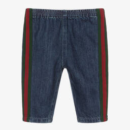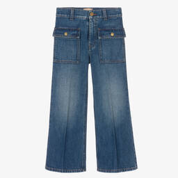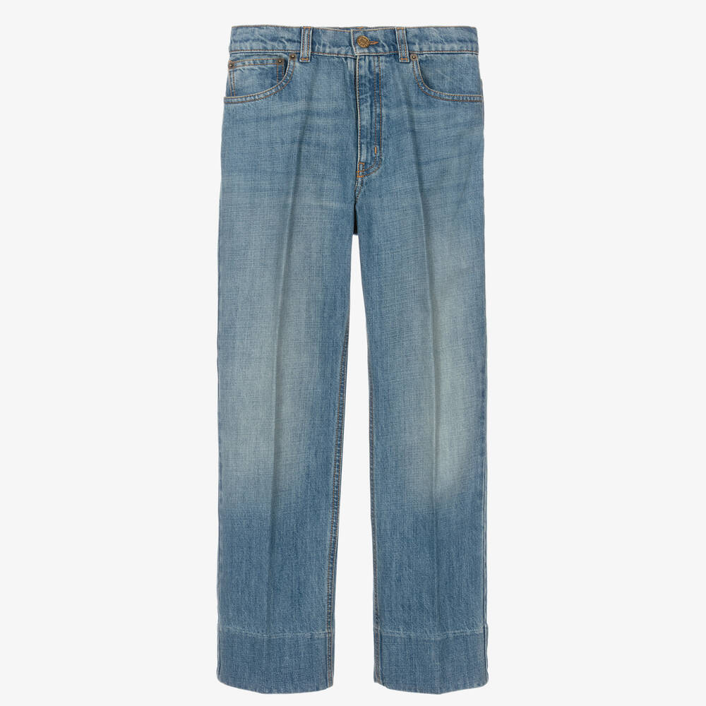 Cool blue stone-washed cotton denim jeans for teen boys by luxury Italian designer Gucci, in a stylish straight-leg fit. Timelessly incorporating signature house codes, the label's leather Interlocking G logo badge is featured on the back. They are complete with a gold logo-embossed hook and zip fastening and classic five-pocket styling.