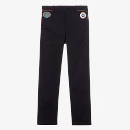 Vintage style brown trousers for teen boys from luxury Italian brand Gucci, made in mid-weight cotton gabardine with a slight stretch. Taking cues from the House codes, there are two retro logo badges on the front, one of which is their classic Interlocking G. There are two front pockets trimmed in blue and red, a zip and button fastening, and an elasticated waist on the back.
