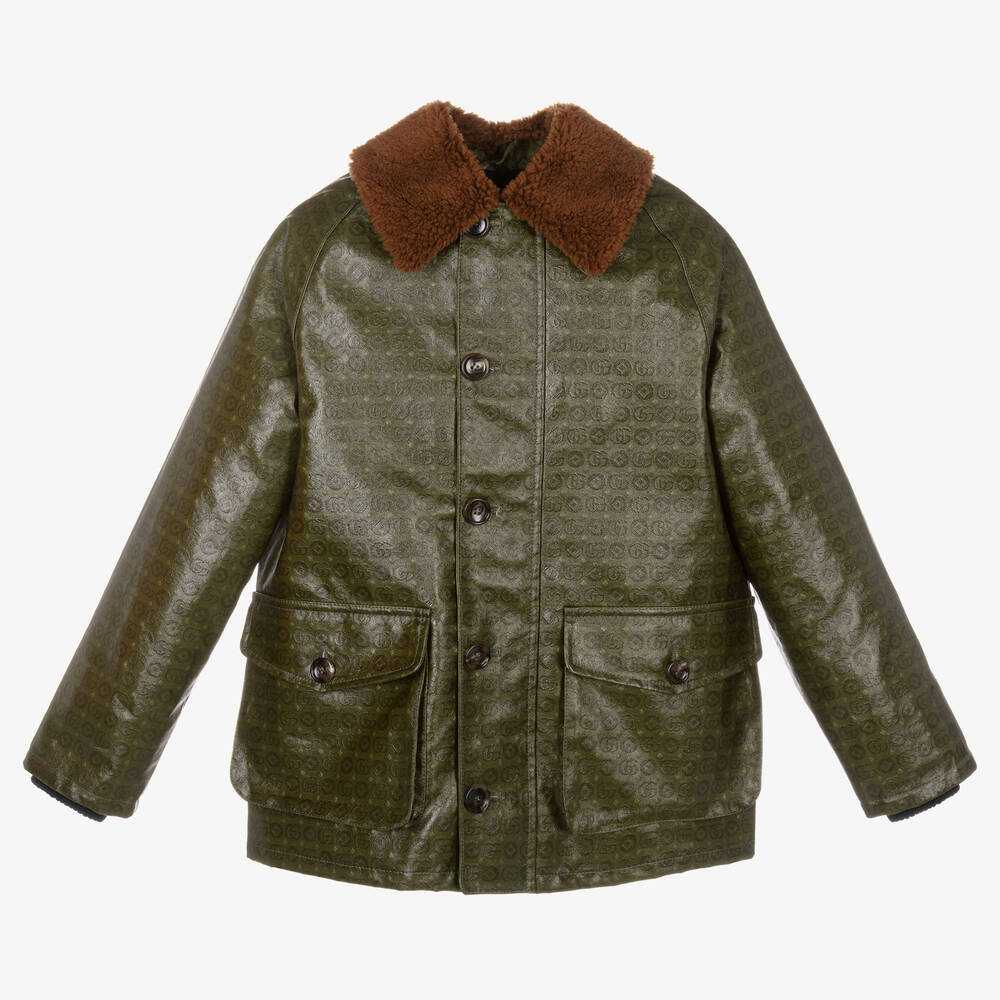 A deep green Italian-made jacket for teen boys and girls from Gucci. The smooth coated cotton-mix fabric is printed with a Double G Geometric pattern for an iconic look. In the label's signature boxy silhouette, it has a brown fluffy shearling collar, logo buttons, and patch pockets. Lined in cotton with ribbed wool cuffs for extra warmth, it has a logo-engraving engraving on the front zip for added designer appeal.