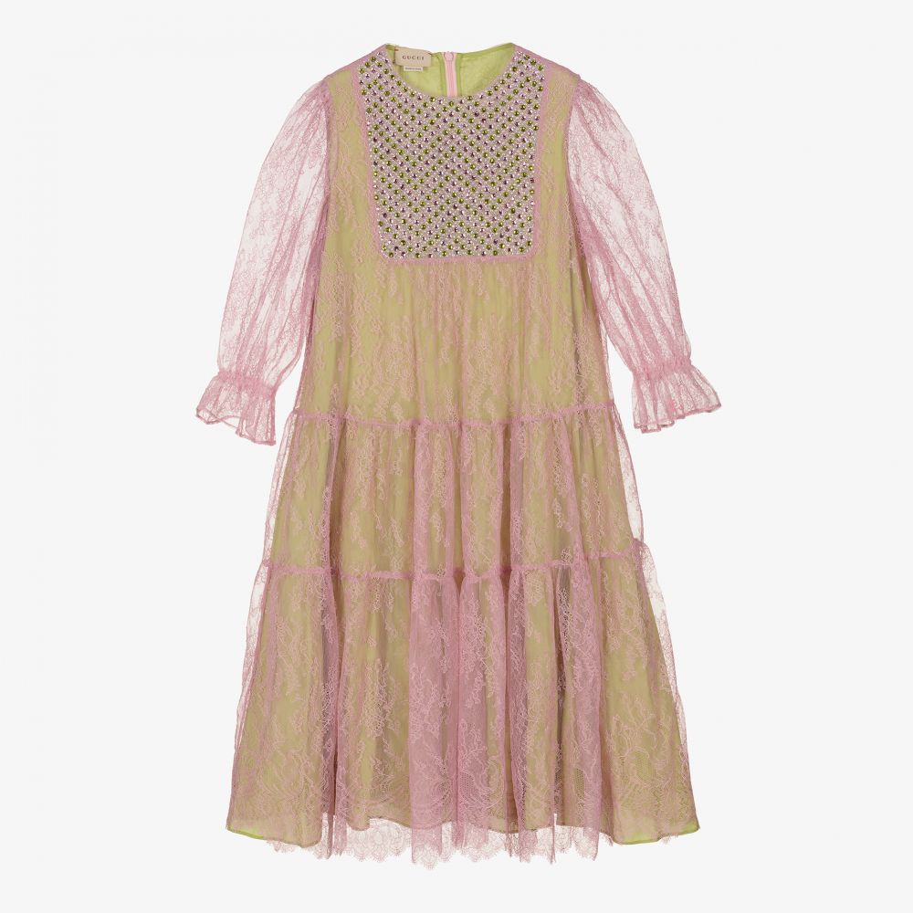 Teen girl green and pink dress for girls by luxury Italian designer Gucci. It has a delicate mauve pink chantilly lace overlay, with a contrasting muted green lining. One of the sheer, three-quarter length sleeves is embroidered with the brand's iconic GG logo and the bodice is intricately decorated with sparkling glass crystals in pink, green and silver. It fastens with a zip on the back.