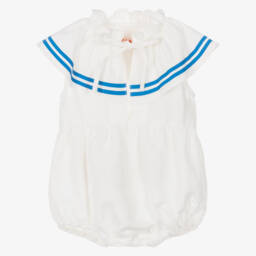 Luxury three-piece white bodyvest set for boys and girls by Italian brand Gucci, presented in an elegant gift box. The bodyvest has the brand's vintage logo print, inspired by the adult collection, with an envelope neckline and poppers underneath for ease of dressing. The hat and bib have the fashion house's green and red Web accent, with adjustable poppers on the bib. All pieces are made from super soft cotton jersey