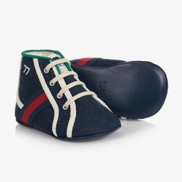 White pre-walker shoes for baby boys and girls by luxury Italian brand Gucci. Styled as a mini version of the Gucci Tennis 1977 sneakers, they have GG logo cotton canvas upper with green and red Web trims. They have supple white leather soles and are fully lined in soft ivory leather. This style fastens with ivory laces.