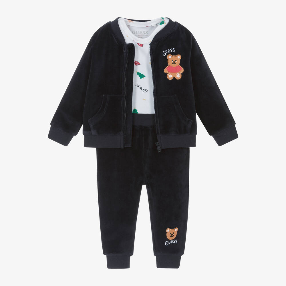 Navy blue velour tracksuit set for baby boys by Guess, with cute teddy appliqués and embroidered logos. The zip-up top has little pouch pockets and the joggers have a comfortable elasticated waist. Ideal for the festive season, the white bodyvest has all-over Christmas prints, with an envelope neckline and easy popper fastenings between the legs.