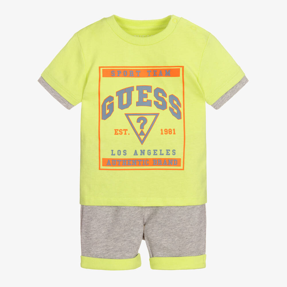 Fun lime green shorts set for baby boys by Guess, made in soft cotton jersey. Fastening with shoulder poppers, the striking T-shirt has a grey and orange sports inspired logo print, with the brand's iconic Triangle on the front. This same print can also be found on the back grey marl shorts, which are designed with an elasticated waist for superior comfort.