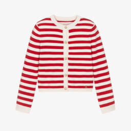 A cute knitted cardigan for baby boys by Guess, in ivory and navy blue with branded button fastenings. Soft and cosy, this preppy style has a V-neck and striped ribbed trims in navy blue and burgundy red. There are patch pockets on the front, detailed with the American brand's cute teddy bear appliqués in brown bouclé fabric.