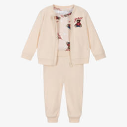 This pale blue cotton tracksuit set for baby boys by Guess features a playful teddy bear motif. The cosy tracksuit is paired with a short-sleeved bodysuit, which fastens with poppers between the legs for easy dressing.