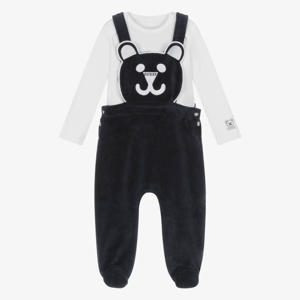 Cute white and navy blue dungarees set for baby boys by Guess, made in soft cotton. The navy blue velour dungarees has a cute teddy bear bib front, embroidered with the designer's logo for branded appeal. It fastens with easy-to-use buttons on the sides and poppers between the legs. A plain white bodyvest completes the set, with an envelope neckline and popper fastenings for easy dressing and changing. This item contains organic cotton fibres.