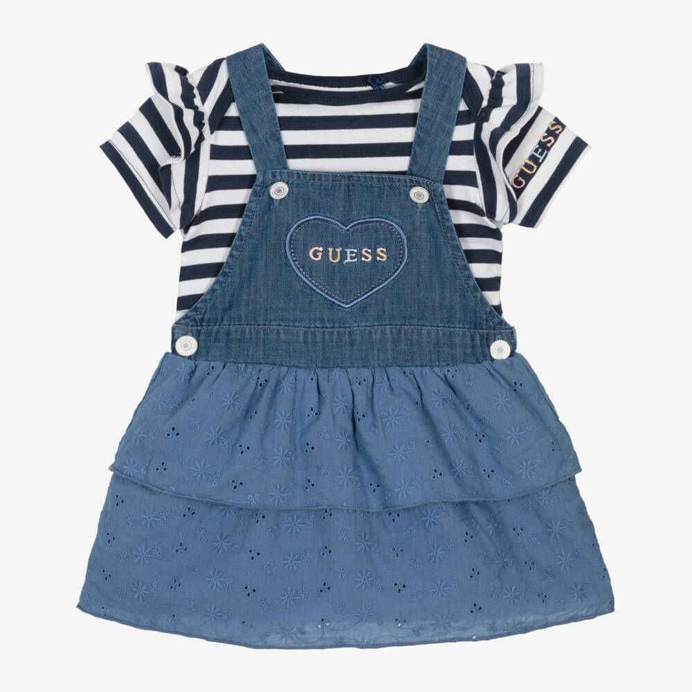 Blue and off-white dress set for baby girls by Guess, made with cotton jersey and denim-look chambray. The striped bodysuit has a practical envelope neckline and multicoloured logo lettering embroidered on one sleeve. Easy poppers fasten between the legs. The paired dungaree dress has button fastenings on each side and adjustable shoulder straps that attach to the bib front. The layered skirt has a pretty floral cutwork design for contrast, while the bodice is detailed with a cute love heart logo motif.