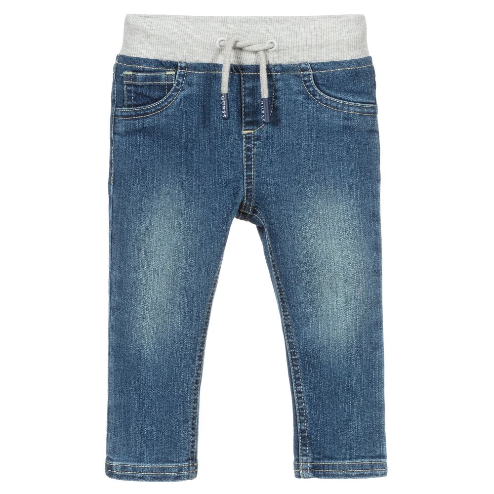 Blue washed denim jeans for baby girls by Guess. There are two pockets on the back with a metal logo badge and a grey elasticated drawstring waist.