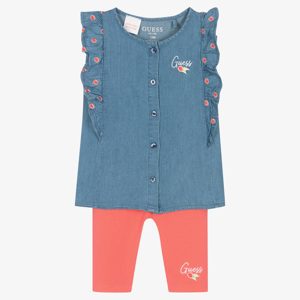 Sweet blue top and pink leggings set for baby girls by American brand, Guess. The lightweight chambray blouse has branded button fastenings on the front and an a white logo and floral embroidery on the chest, with matching pink embroidered roses on the ruffle trims. It pairs with cute cropped leggings that have a matching embroidered logo on the ankle.