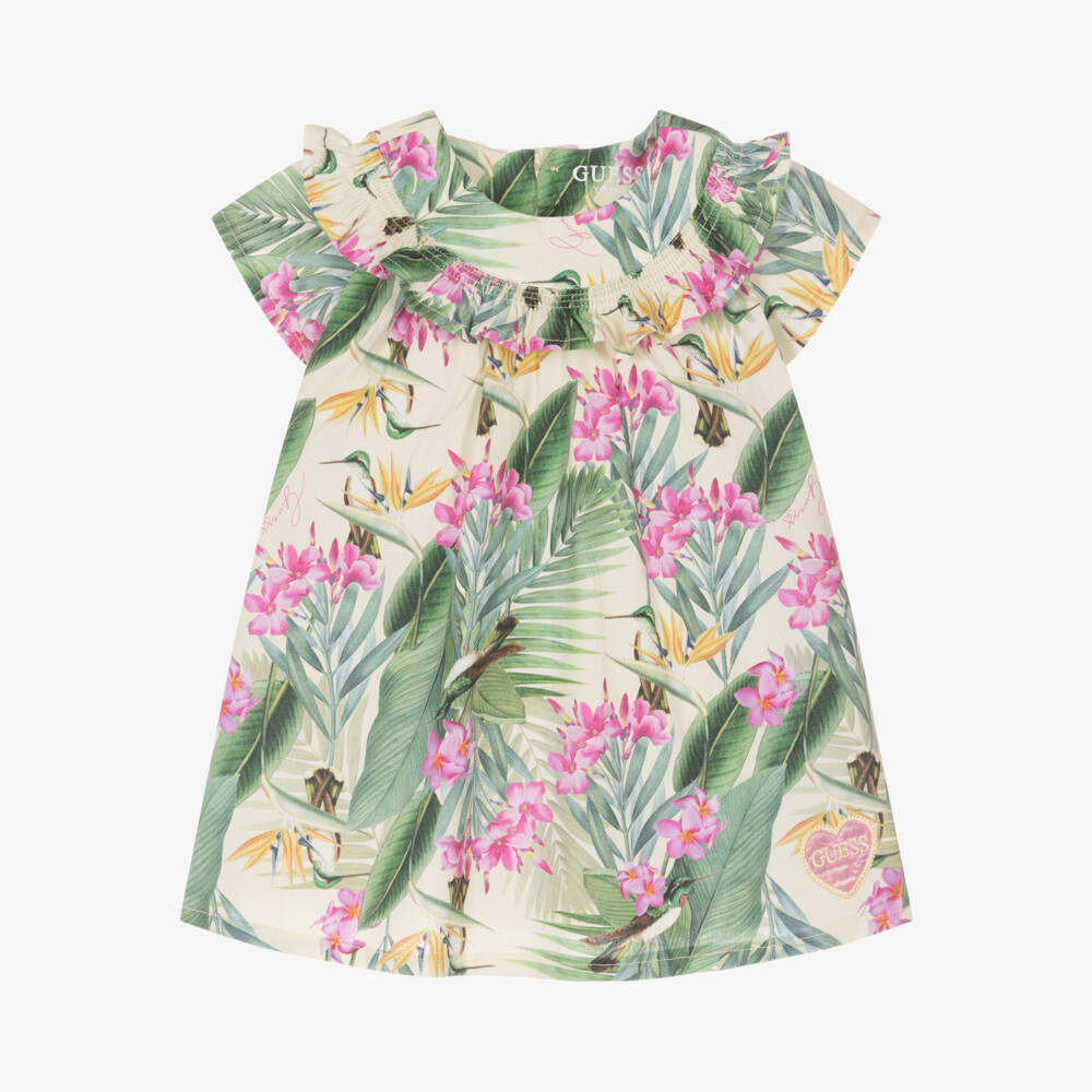 A cute green cotton dress for baby girls by American brand Guess, ideal for warm weather days. Cool and comfortable, it is patterned with pink and green tropical flowers, hummingbirds and subtle logos on a pastel yellow background. There is a pretty ruffle trimming the neckline and buttons to fasten on the back. The dress is lined for comfort in lightweight voile and comes with a pair of matching knickers for a sweet finish.