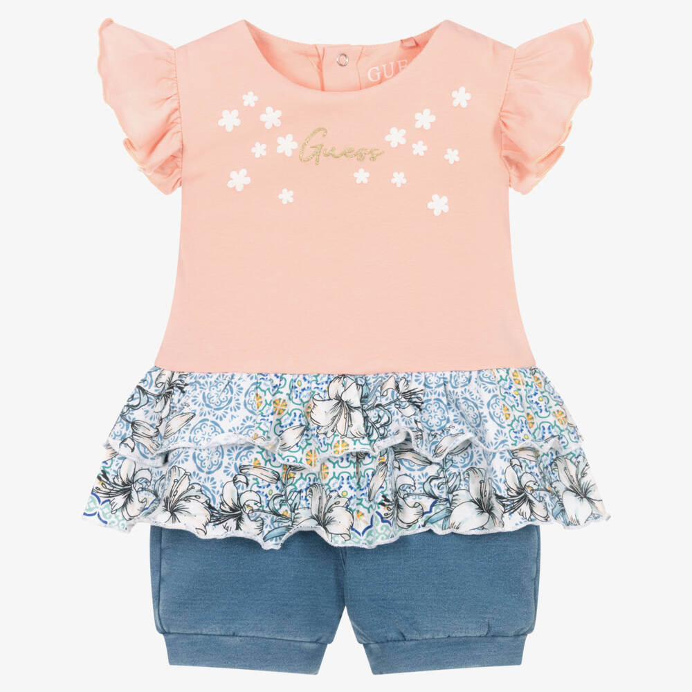 A fun pink and blue shorts set for baby girls by Guess, made in soft cotton jersey. The pretty pink top has a glittery gold logo across the chest, bordered with little white flowers. It has a ruffled hem with a blue, tile-inspired floral design. There are popper fastenings on the back to help with dressing. The coordinating shorts have the appearance of washed denim with a stretchy waistband for maximum comfort. The heart-shaped pocket on the back is finished with matching logo embroidery and a charming pink flower.
